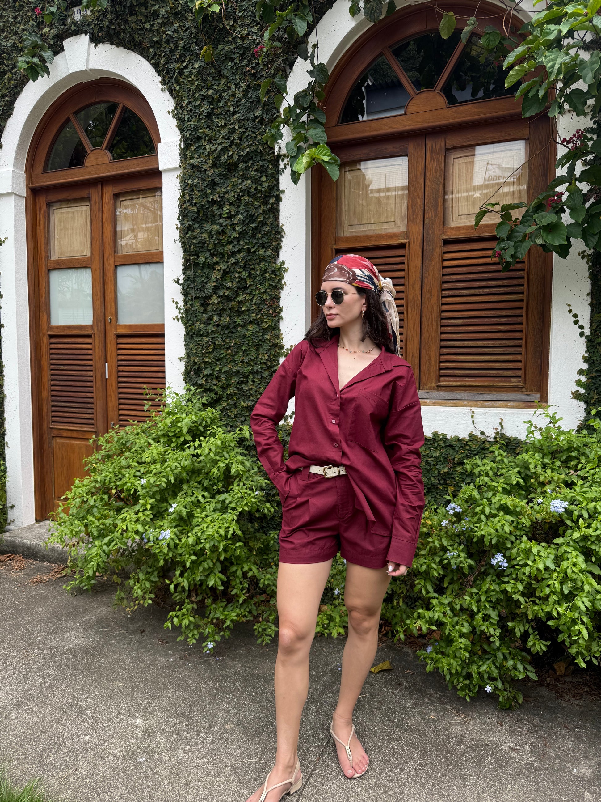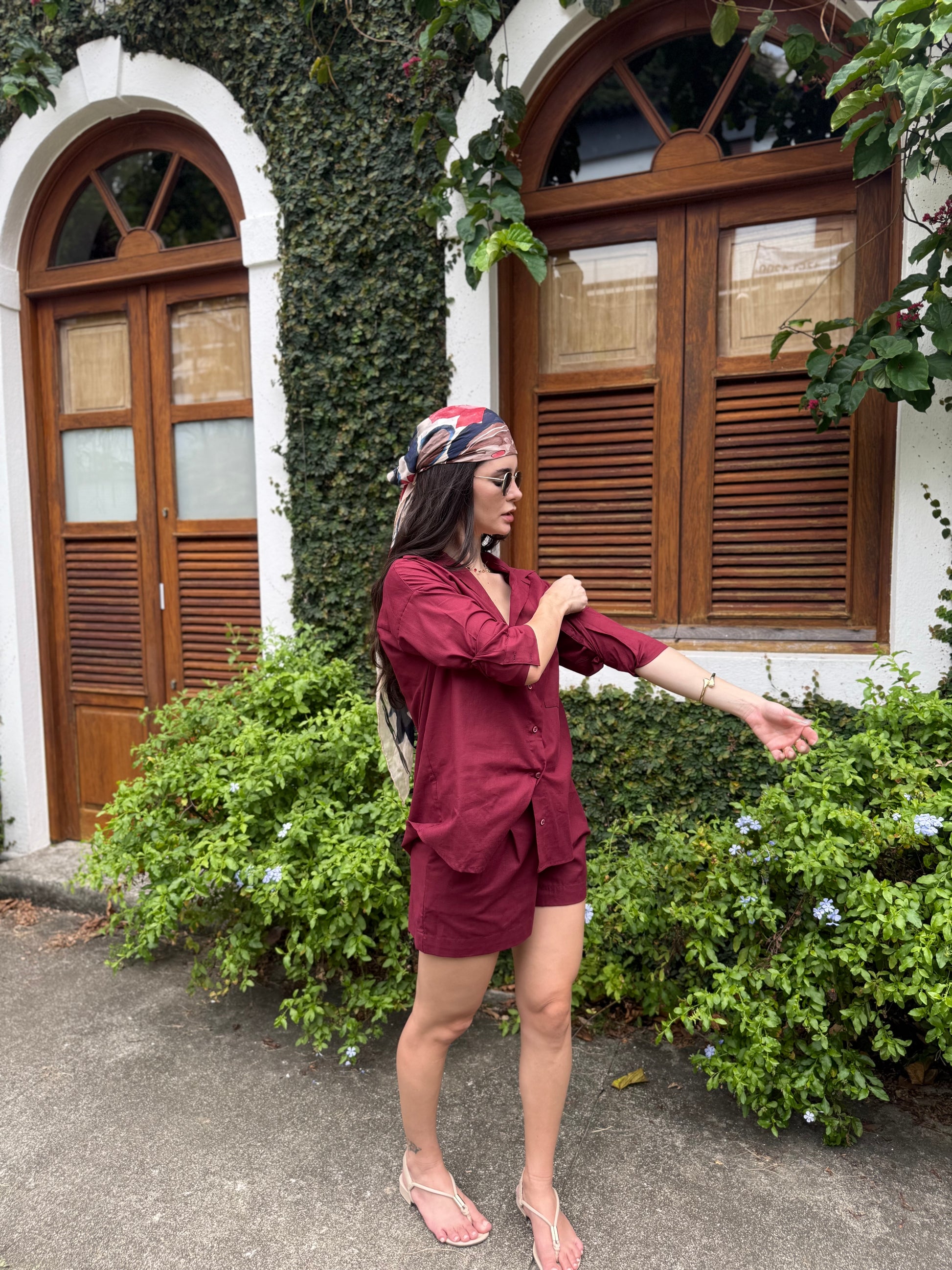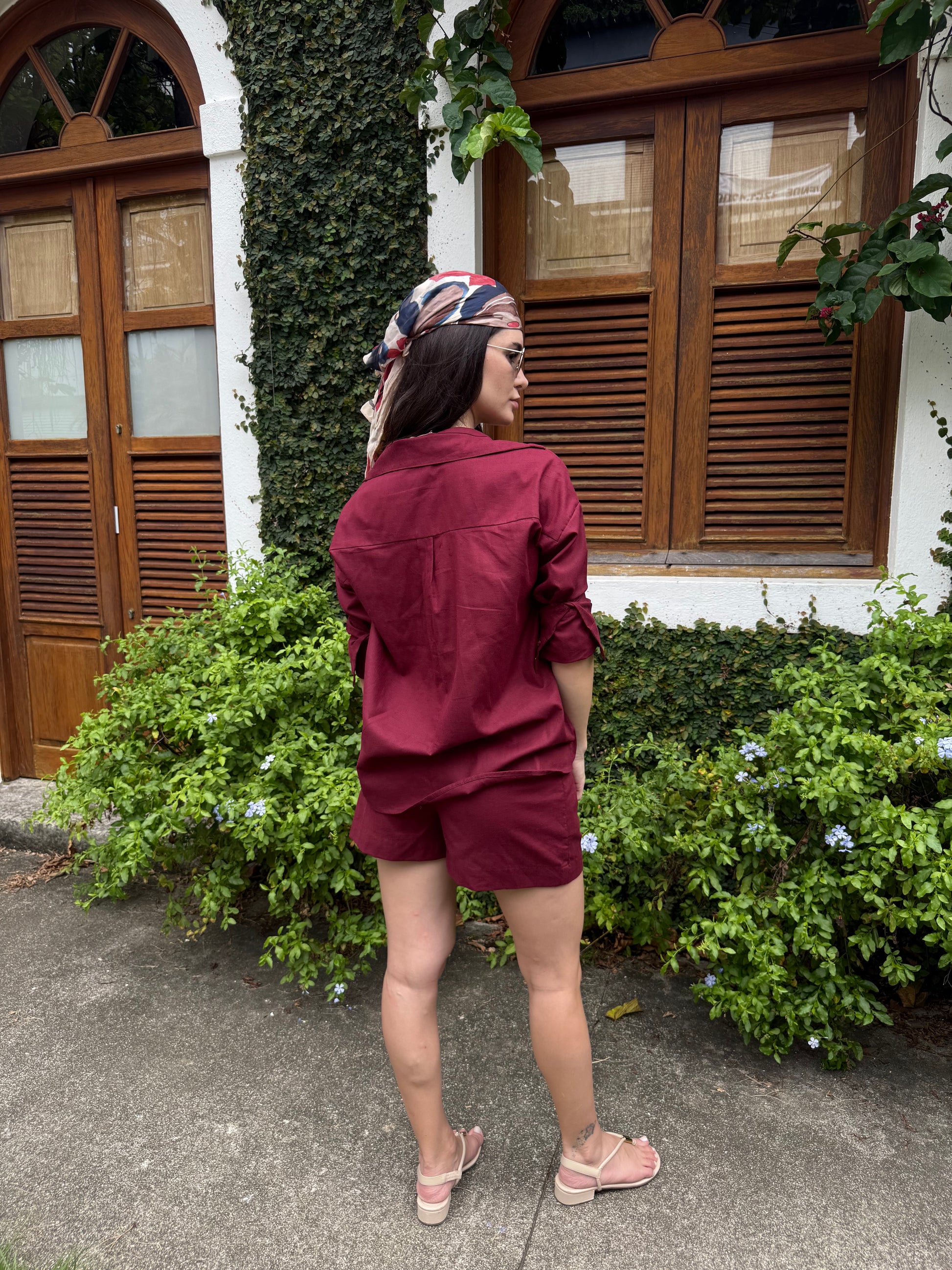 A bermuda complementa o conjunto com uma alfaiataria leve: possui duas pregas frontais, que trazem caimento elegante, e botão forrado, reforçando o cuidado nos detalhes. O resultado é um visual versátil, confortável e consciente — ideal para o dia a dia, viagens ou momentos de descanso.