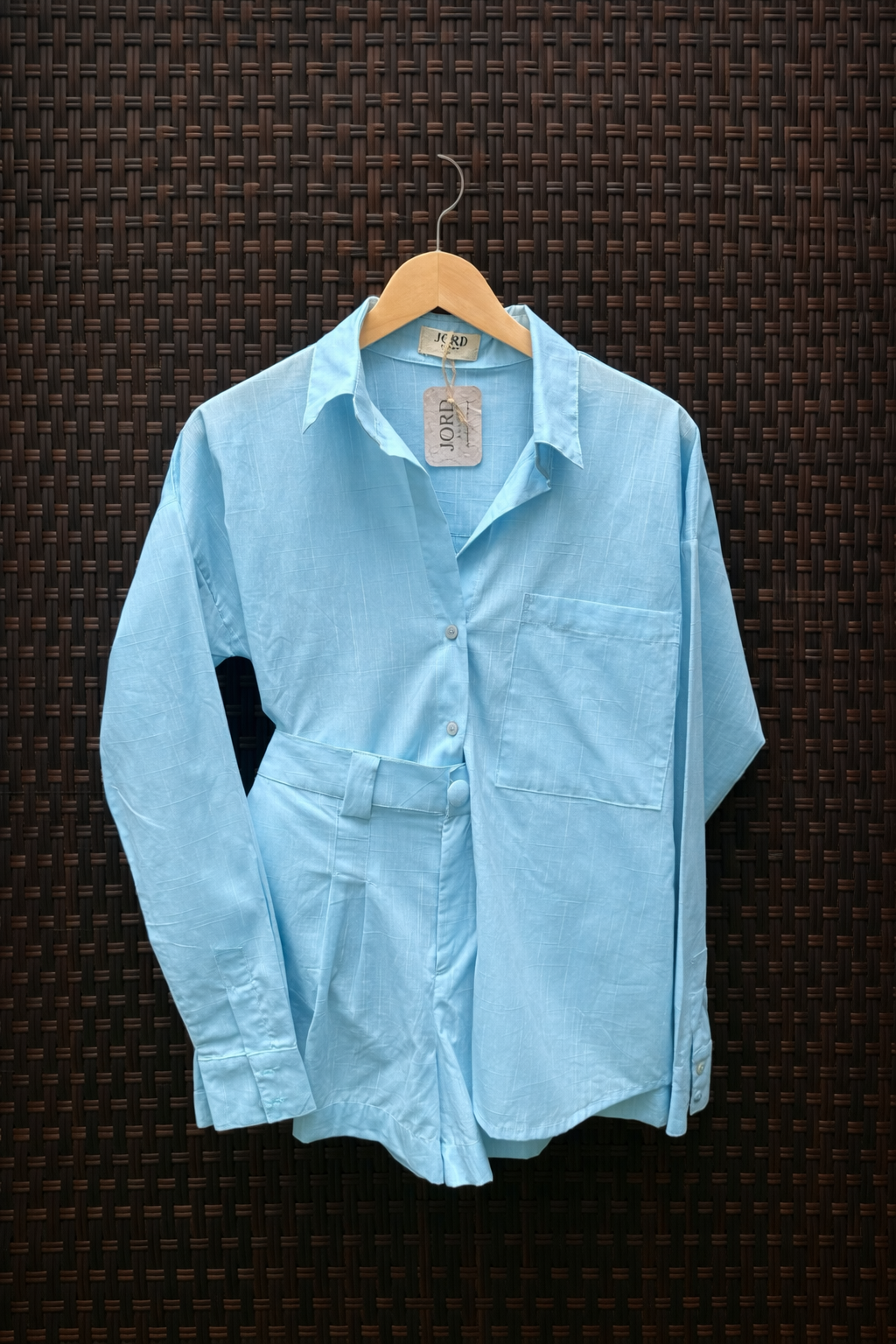 A camisa oversize tem modelagem ampla e solta, garantindo frescor e liberdade de movimento. Os botões em madrepérola adicionam um acabamento sofisticado e atemporal, valorizando o design minimalista da peça.
